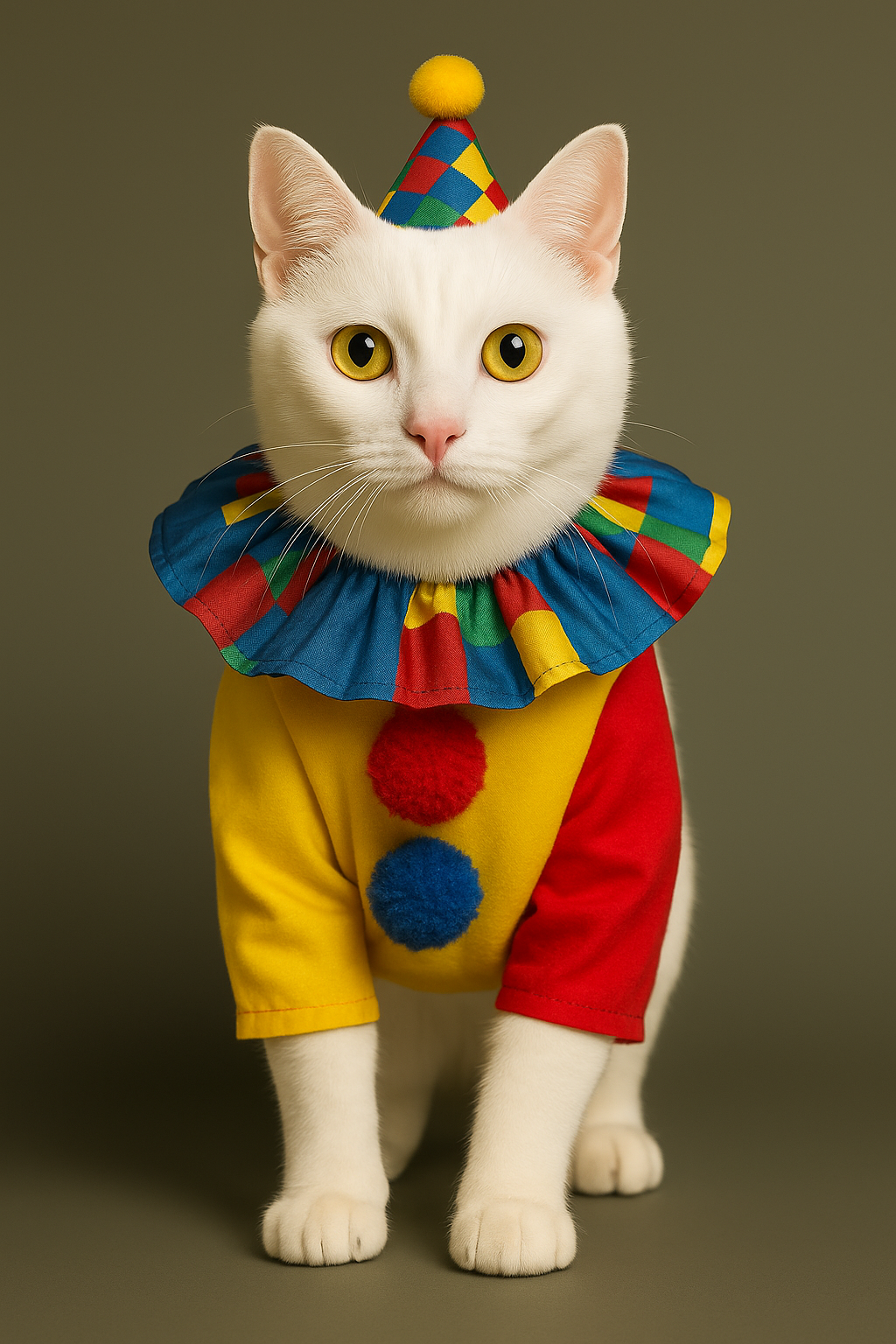 Now imagine your pet in this cheerful getup — wearing a puffy ruffled collar, a bright curly wig, and balancing a tiny toy horn or balloon. Their goofy grin and wagging tail complete the performance! A whimsical photo like this turns your furry friend into a hilarious little clown, spreading smiles, silliness, and absolutely paw-some circus fun!