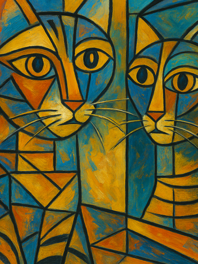 Now imagine your pet in this fantastical world — their face reimagined with fun, angular shapes, wide eyes looking in different directions, bold patches of color swirling across their fur. A whimsical photo like this transforms your furry friend into a playful Cubist masterpiece, full of charm, surprise, and a whole lot of paw-some personality. It’s creative, quirky, and absolutely unforgettable!