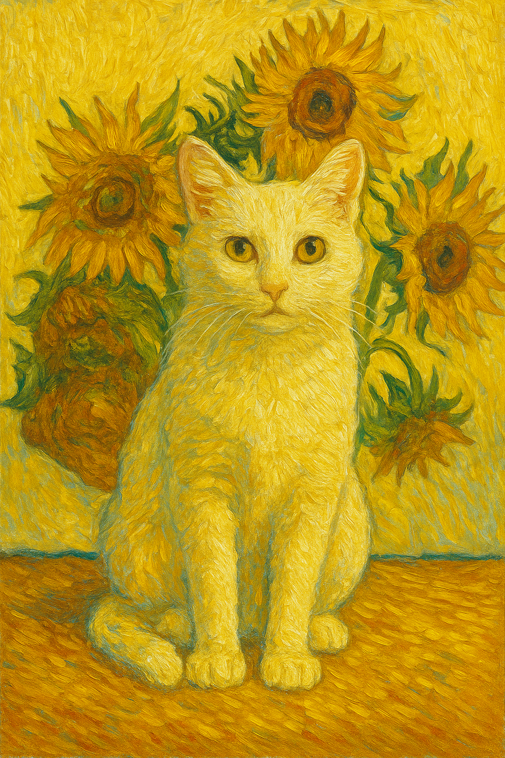 The Sunflower style is Van Gogh’s most iconic worlds — golden blooms of Sunflowers. With thick, expressive brushstrokes, vibrant yellows, deep blues, and swirling energy, this style feels alive, as if nature itself is dancing in brilliant color and light. Now imagine your pet in this vibrant scene — sitting proudly among towering sunflowers. Their fur glows with textured strokes of yellows and blues, while playful spirals of light wrap around them like a gentle breeze. A whimsical photo like this transforms your furry friend into a joyful, energetic Van Gogh-inspired masterpiece — dreamy, vibrant, and absolutely paw-some!